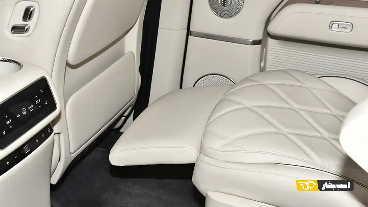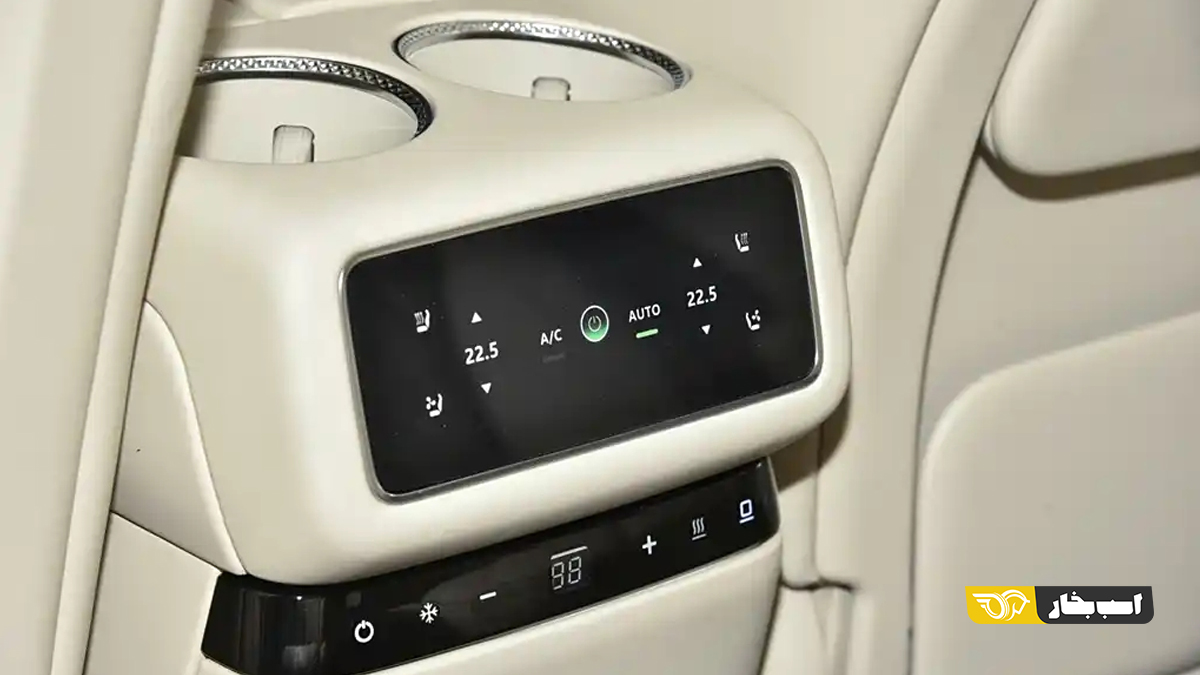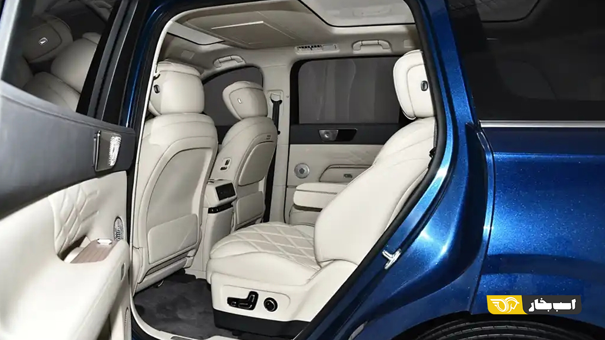 فرمان دوشاخه با طراحی جدید، حذف شیفتر گیربکس از پنل میانی دو صندلی و صندلی های جلو با حالت دربرگیرندگی کامل نیز از دیگر نکات حائز اهمیت در ردیف جلوی T11 هستند، اما نکات مهم تر را باید در ردیف دوم جستوجو کنید. در این ردیف شاهد نصب دو صندلی کاپیتانی هستیم. سیستم تهویه به صورت ناحیه مجزا برای ردیف دوم با قابلیت انواع تنظیمات ارائه شده است. گرمکن و سردکن صندلی ها، استراحتگاه زیر زانوی صندلی ها و تنظیمات برقی آن ها نیز از دیگر امکاناتی است که در این ردیف به چشم می آید. با گذر از این موارد باید توجه شما را به صفحه نمایش بسیار بزرگ ردیف دوم که به صورت مرکزی روی سقف خودرو نصب شده است جلب کنیم. این صفحه نمایش عملکردی مشابه با ب ام و سری ۷ جدید و برخی از محصولات لکسوس دارد.