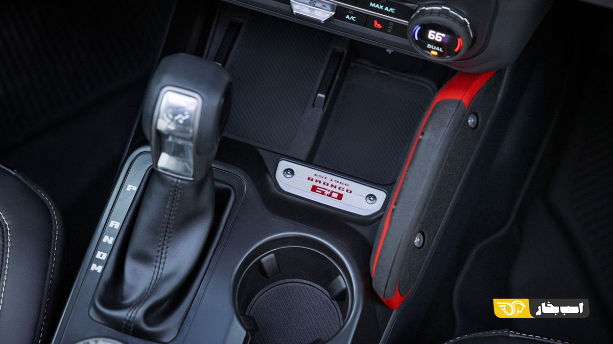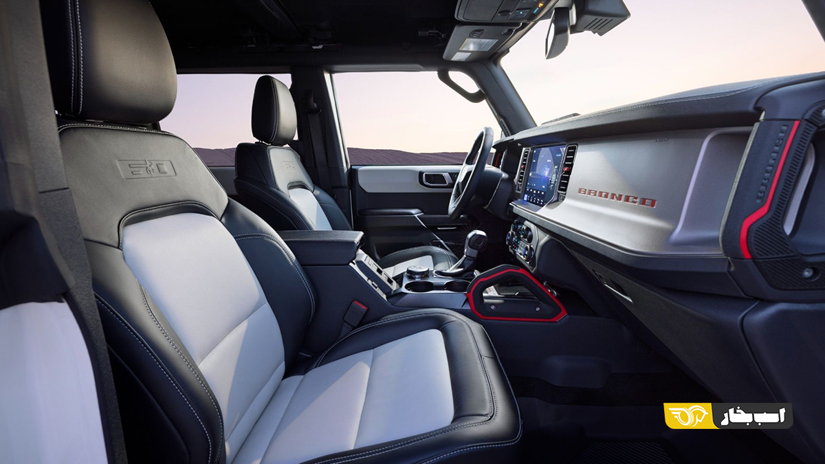 پوشش سخت سفید ویمبلدون برای لاستیک زاپاس، همراه با نوشته قرمز «BRONCO» و نشان مشکی مات فورد، به عقب خودرو جلوهای لوکستر میبخشد. دستههای چرمدوزیشده، زیرآرنجیهای با روکش وینیل مقاوم دریایی و پارکابیهای (Running Boards) با طراحی بهبودیافته، کابین را به فضایی راحتتر و بادوامتر تبدیل کردهاند. این تغییرات نشاندهنده تلاش فورد برای ارائه تجربهای لوکس بدون از دست دادن روحیه آفرود برانکو است.