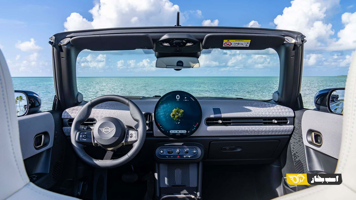 در داخل خودرو، جزییات سادهشده و سطوح پارچهای در بیشتر خودرو دیده میشود. نمایشگر معروف گرد با قطر ۲۴ سانتیمتر (۹.۴۵ اینچ) از نوع OLED همچنان در خودرو وجود دارد. همچنین نوار کلیدهای آشنا در زیر نمایشگر به چشم میخورد. اطلاعات ضروری نیز از طریق نمایشگر هدآپ در میدان دید راننده نمایش داده میشود. برای صندلیها، امکان انتخاب رنگ خاکستری یا مشکی در ترکیب با پارچه و چرم مصنوعی به رنگ آبی وجود دارد. صندلیهای ورزشی JCW به رنگ بژ و آبی تیره «نایتشیب» از چرم مصنوعی با دوخت متضاد نیز برای این خودرو عرضه میشوند.