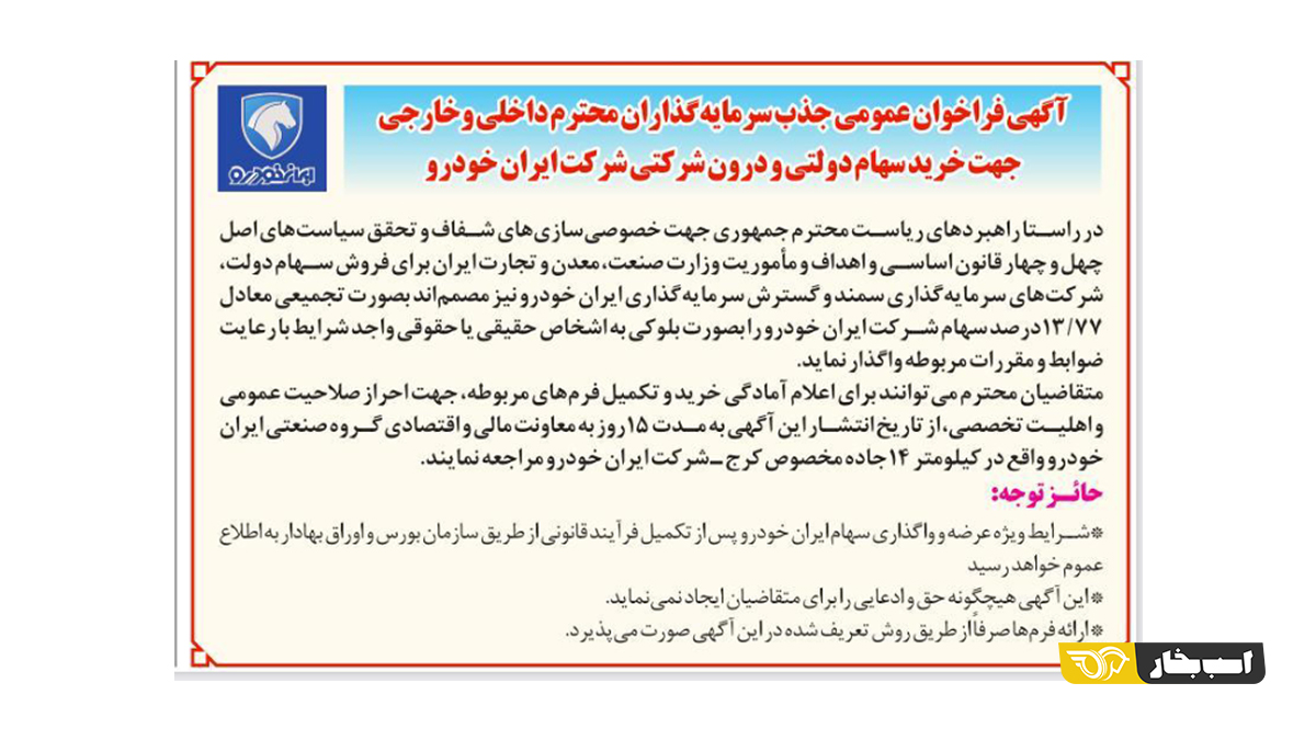 “در راستای راهبردهای ریاست محترم جمهوری جهت خصوصی سازیهای شفاف و تحقق سیاستهای اصل چها و چهار قانون اساسی و اهداف و ماموریت وزارت صنعت، معدن و تجارت ایران برای فروش سهام دولت، شرکتهای سرمایه گذاری سمند و گسترش سرمایهگذاری ایران خودرو نیز مصمماند به صورت تجمیعی معادل ۱۳.۷۷ درصد سهام شرکت ایران خودرو را به صورت بلوکی به اشخاص حقیقی و حقوقی واجد شرایط با رعایت ضوابط و مقررات مربوطه واگذار نماید.