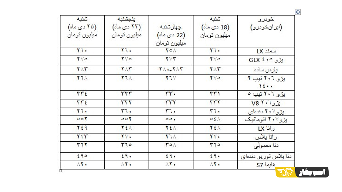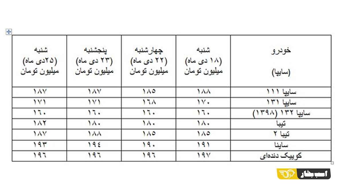 قیمت انواع پرتیراژهای خودروسازان در ابتدای هفته گذشته، چهارشنبه ، پنجشنه هفته گذشته و روز گذشته (شنبه) به شرح زیر است: