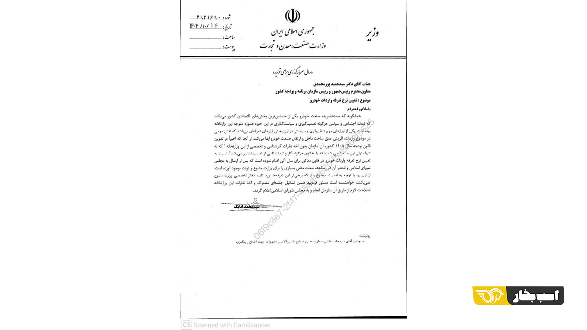 این نامه در حالی نوشته شده است که افزایش نرخ محاسبه یورو از ۸۵ هزار تومان به ۱۰۳ هزار تومان، بهشدت قیمت تمامشده خودروهای وارداتی را افزایش خواهد داد.