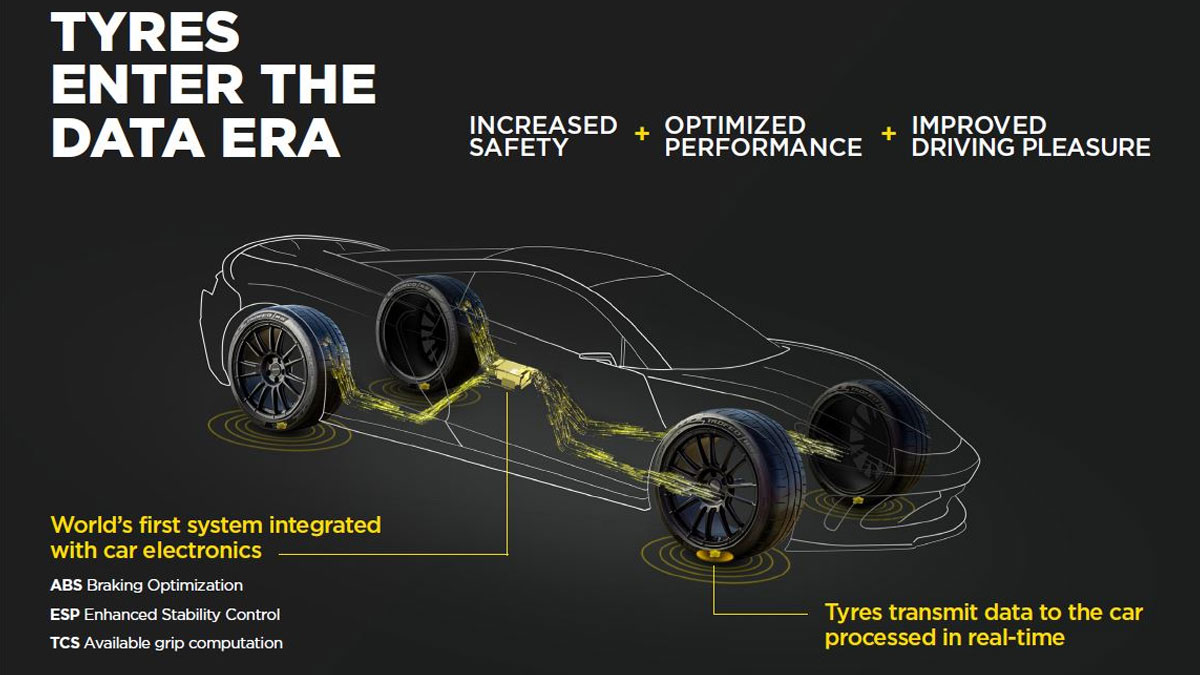پیرلی و بوش از پیش این مفهوم را با تایرهای ابرخودروی پاگانی Utopia Roadster به نمایش گذاشتهاند. در این خودرو نسخه توسعهیافته تایرهای پیرلی P Zero Trofeo RS با سنسورهای تعبیهشده به سیستم کنترل پایداری عرضهشده توسط بوش و همچنین ABS و سیستم کنترل اصطکاک متصل میشود تا در نتیجه بتواند ۸۵۲ اسب بخار تولید شده توسط موتور ۶ لیتری V-12 توئین توربوشارژ Utopia را بهتر مهار کند.