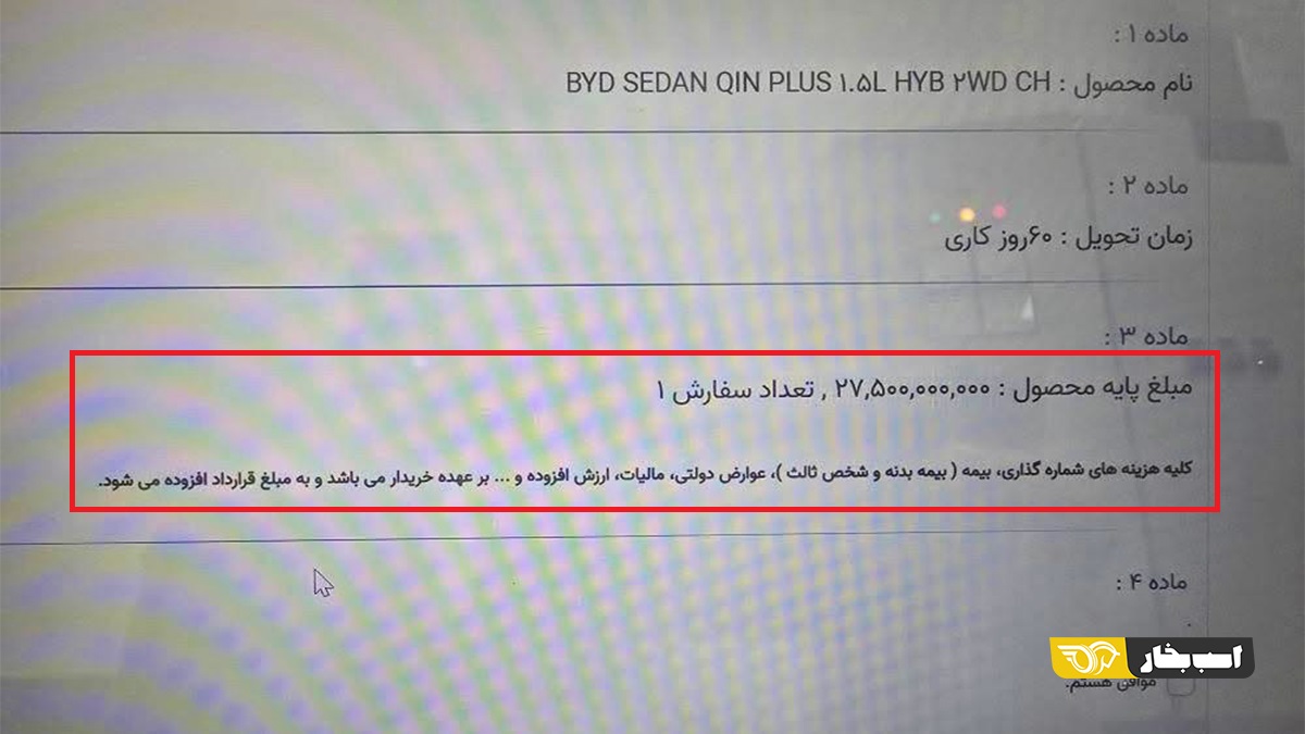 بند جدید قرارداد خرید بی وای دی چین پلاس: کلیه هزینههای شمارهگذاری، بیمه (بیمه بدنه و شخص ثالث)، عوارض دولتی، مالیات، ارزش افزوده و… برعهده خریدار میباشد و به مبلغ قرارداد افزوده میشود.