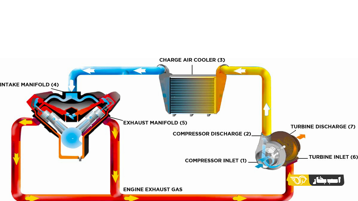 به طور خلاصه می توان گفت گازهای حاصل از احتراق وارد توربوشارژر می شوند و سپس پره های توربو را به گردش درمی آورند. در این مرحله، پره های دیگر توربو نیز دوران می کنند و هوای ورودی به موتور را فشرده می سازند. با فشرده شدن هوای ورودی، دمای آن نیز زیاد می شود و در این قسمت نیاز است تا از دمای آن کاست که این کار را اینترکولر بهکاررفته در سیستم انجام می دهد.