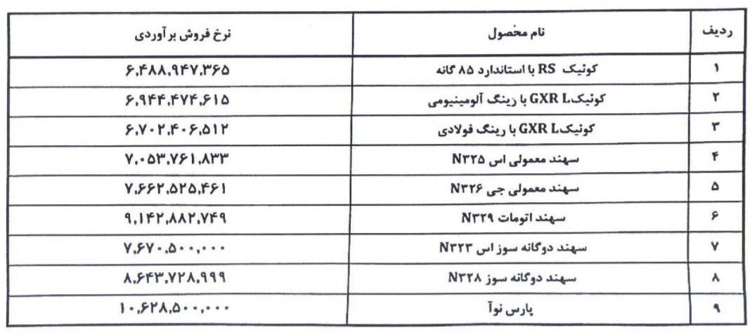 | نام خودرو | قیمت پایه قبل | قیمت پایه جدید |