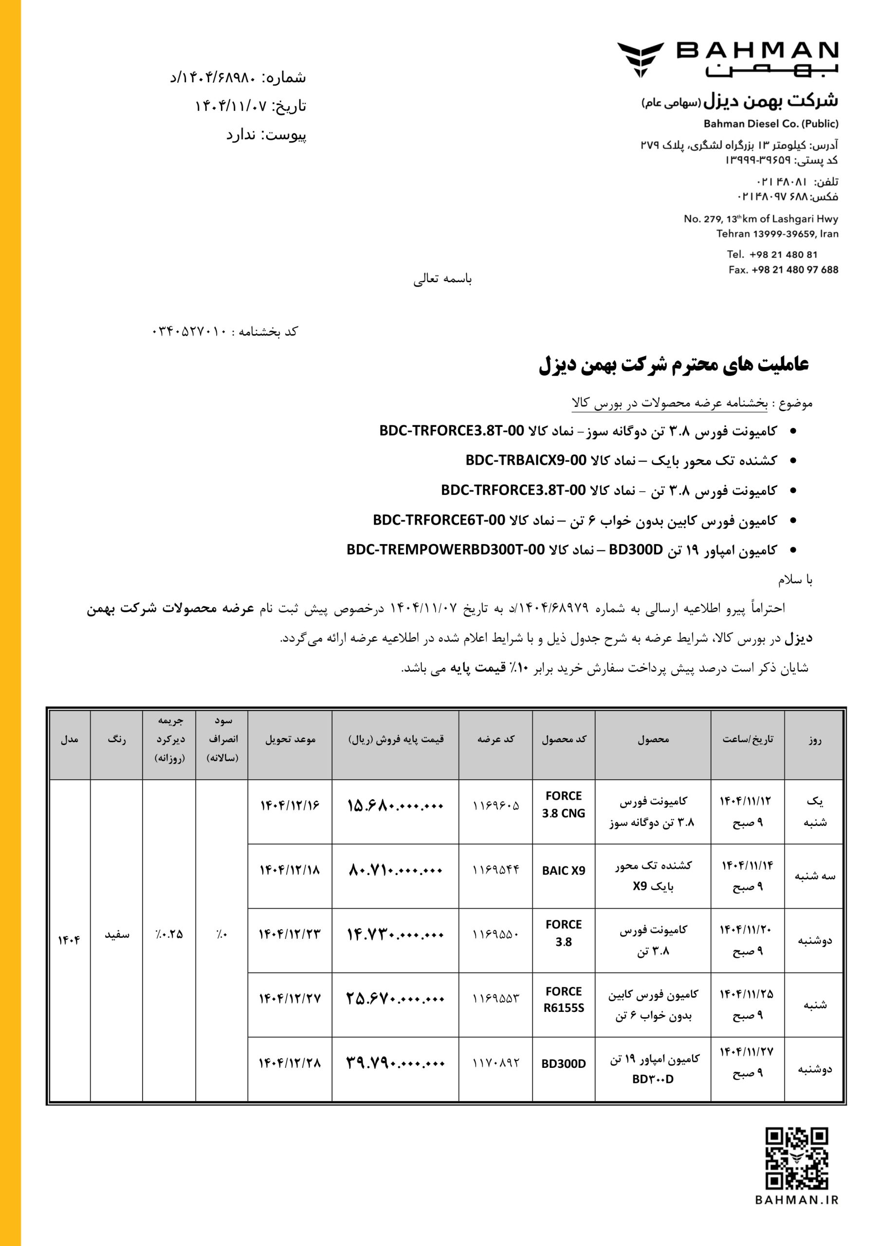 شرایط فروش محصولات تجاری بهمن دیزل در بورس کالا – تحویل فوری ویژه بهمن ماه ۱۴۰۴