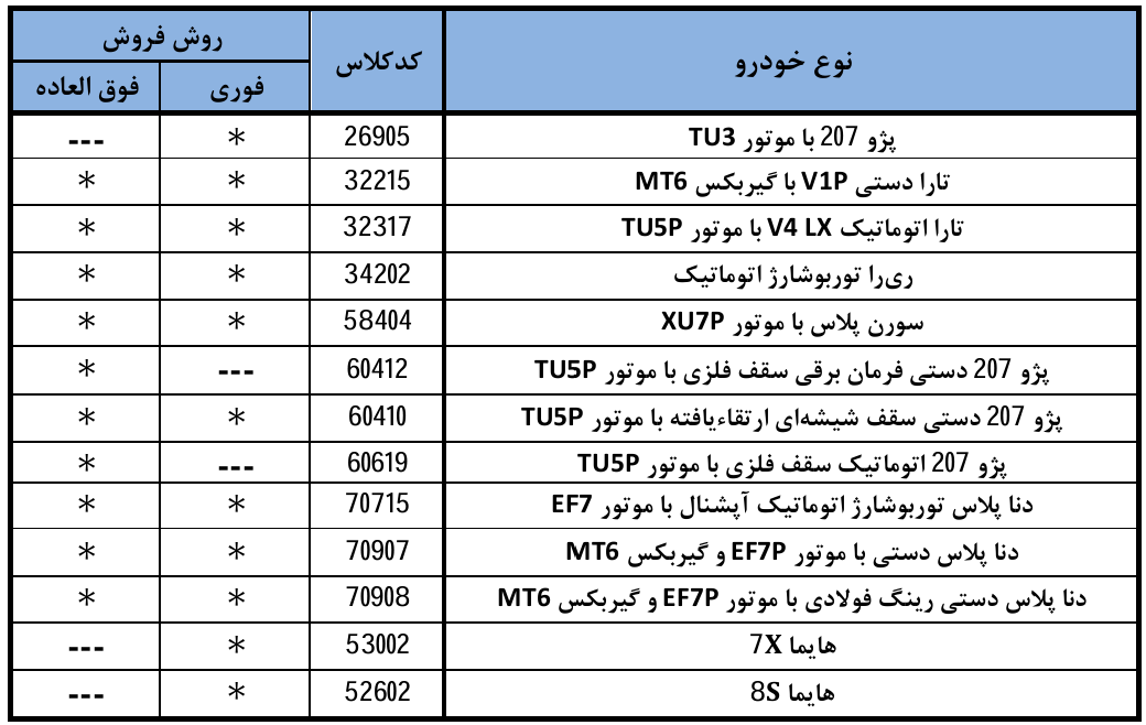 در این طرح ۱۳ خودروی پژو ۲۰۷ با موتور TU3، تارا V1P، ری را، تارا اتوماتیک V4، سورن پلاس XU7P، پژو ۲۰۷ دستی TU5P سقف فلزی فرمان برقی، پژو ۲۰۷ دستی سقف شیشهای TU5P، پژو ۲۰۷ اتوماتیک سقف فلزی، دنا پلاس توربو آپشنال، دنا پلاس دستی ۶ سرعته EF7P، دنا پلاس دستی ۶ سرعته EF7P با رینگ فولادی، هایما 8S و هایما 7X در دو روش فروش فوری و فوقالعاده عرضه خواهند شد.