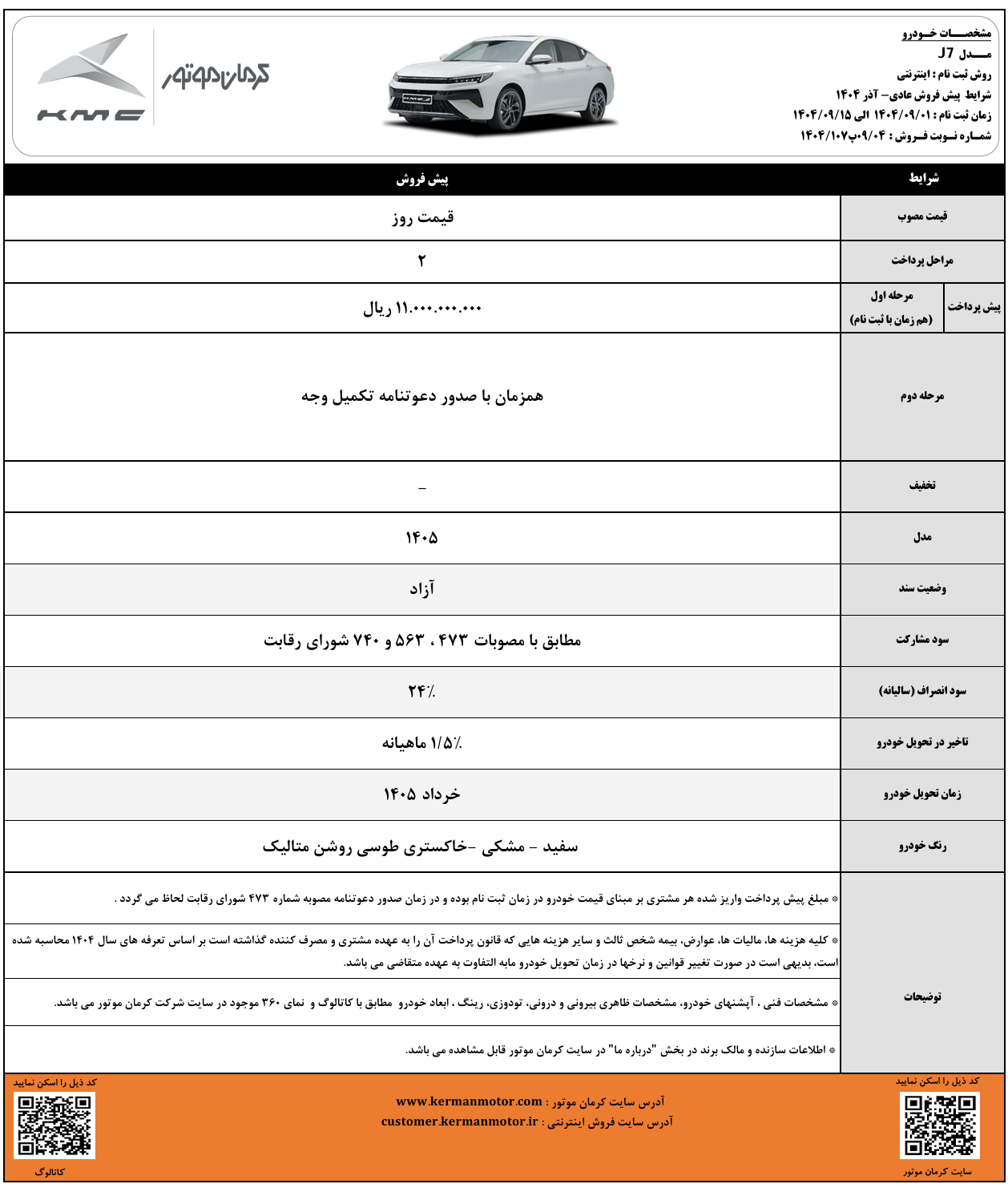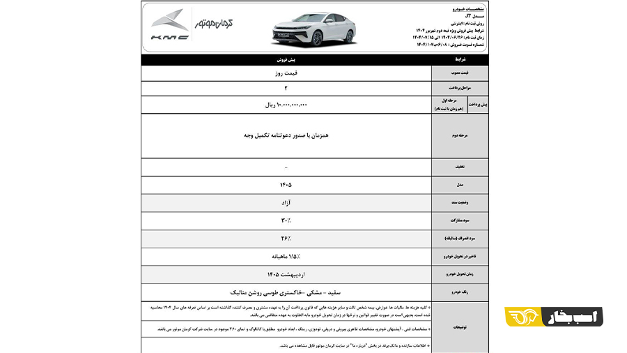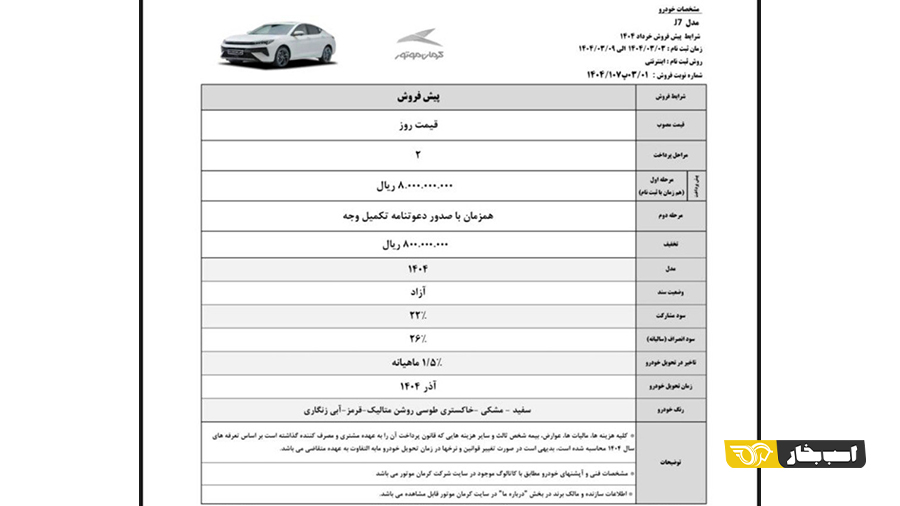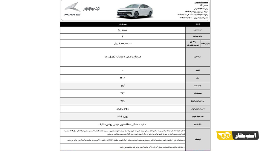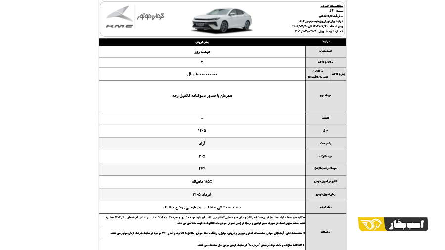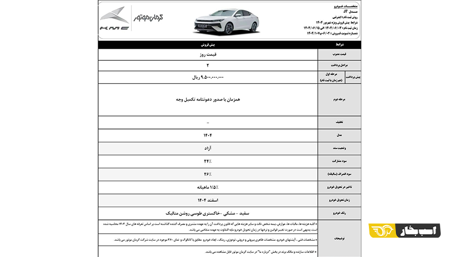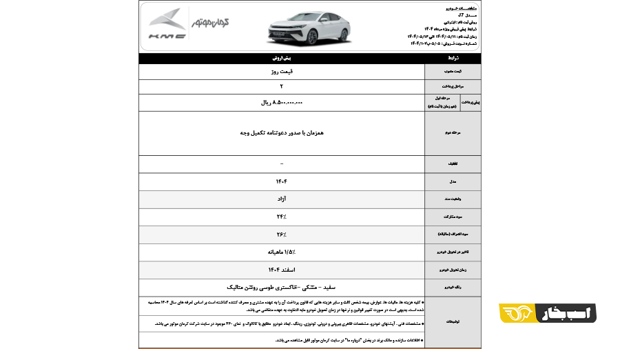 شرایط پیش فروش کی ام سی J7 با پیش پرداخت ۱ میلیارد و ۴۵۰ میلیون تومانی و موعد تحویل مرداد ۱۴۰۵ برای بهمن ماه ۱۴۰۴ اعلام شد.