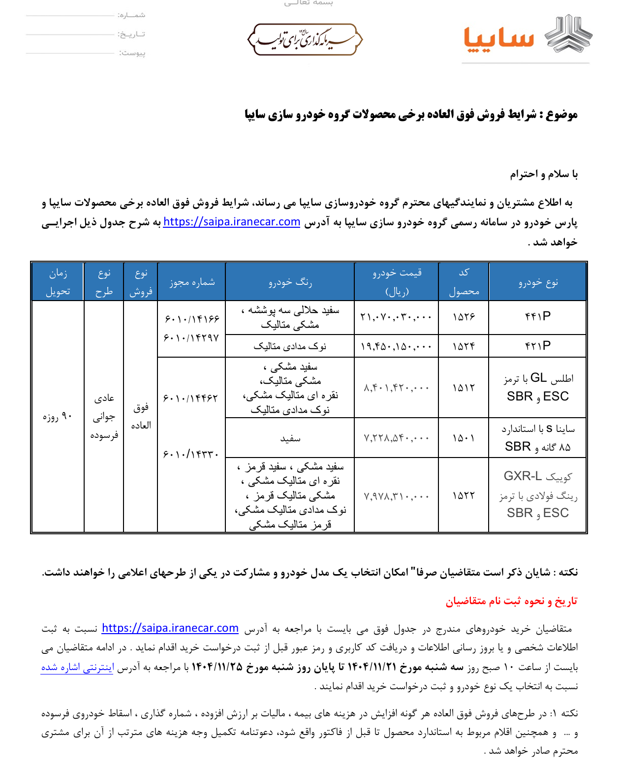 | مهلت پیش ثبت نام و انتخاب خودرو | یکشنبه ۲۳ شهریور الی چهارشنبه ۲۶ شهریور ۱۴۰۴ |