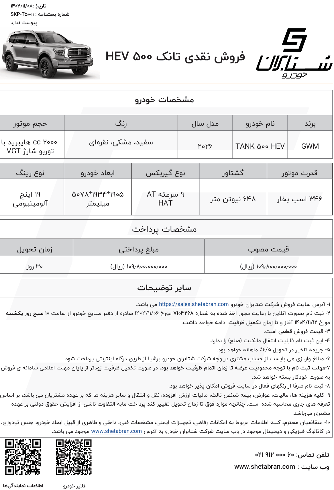 حال شرکت عرضهکننده این خودرو شرایط فروش رسمی نسخه وارداتی تانک ۵۰۰ هیبرید با مدل ۲۰۲۶ را به همراه قیمت نهایی فروش آن اعلام کرده است تا ثبتنامش شروع شود.