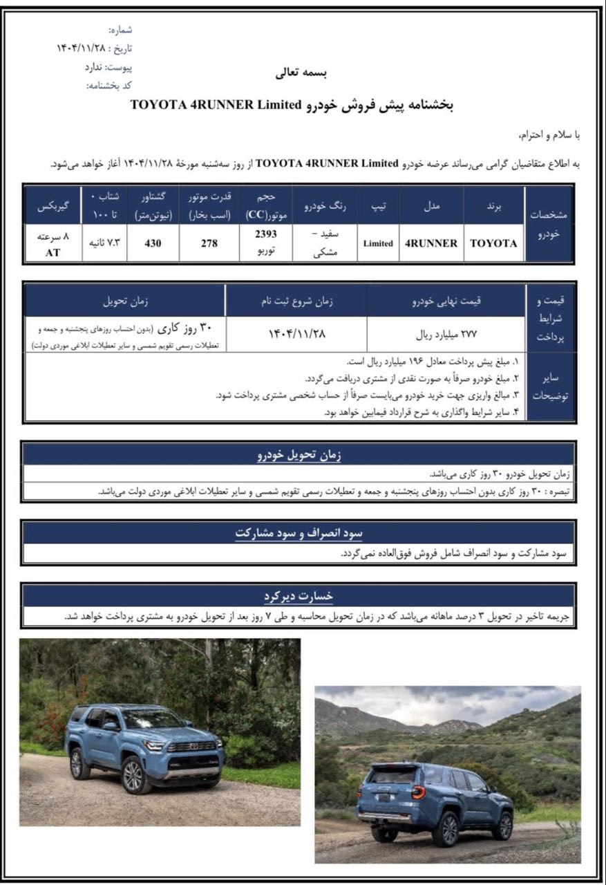 شرکت آذریوردسال اولین شرایط فروش یکی از جذاب ترین شاسی بلندهای تویوتا یعنی ۴ رانر (4runner) را در دو تیپ لیمیتد و پلاتینیوم با قیمت نهایی قطعی اعلام کرد.