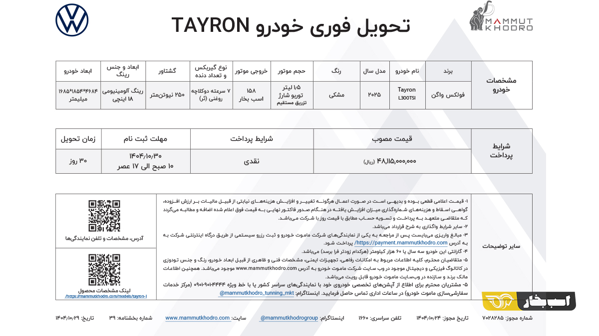 طبق اعلام ماموت خودرو، بخشنامه فروش فولکس واگن تایرون L با قیمت مصوب ۴ میلیارد و ۸۱۱ میلیون و ۵۰۰ هزار تومان از ساعت ۱۰ تا ۱۷ روز سهشنبه ۳۰ام دی ماه ۱۴۰۴ فعال است تا علاقهمندان به خریدش بتوانند نسبت به ثبتنام آن اقدام کنند. مهلت تحویل در شرایط فروش جاری ۳۰ روز اعلام شده است.