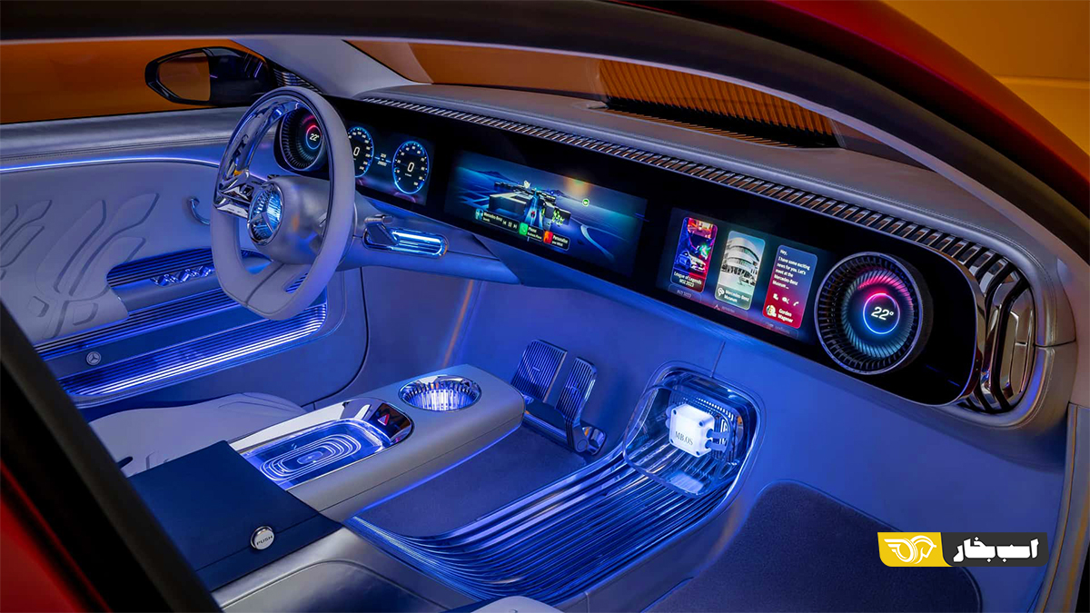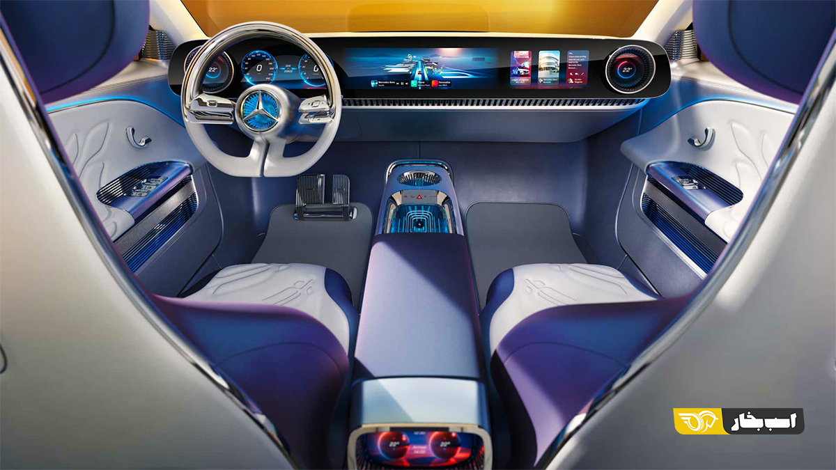 کابین کانسپت جدید مرسدس توسط پنج نمایشگر روی داشبورد احاطه شده است که به گفته مرسدس، از سیستم عامل کاملاً جدید MB.OS بهره می گیرند. این سیستم که از پردازنده آب خنک انویدیا استفاده میکند، می تواند براساس سلایق شخصی راننده تنظیم شود و قابلیت شخصی سازی بسیار بالایی دارد. از پنج نمایشگر مذکور، دو عدد به صورت دایره ای در دریچه های تهویه توربینی ادغام شدهاند که برای کنترل سیستم تهویه دو منطقه ای استفاده میشوند. صندلی ها با تریم چرمی ناپا و دورنگ، غربیلک فرمان با طراحی خاص و تا حدودی کلاسیک خود، کنسول مرکزی شناور با جای لیوان، پد شارژر بی سیم (شارژر وایرلس) نورانی و استفاده از دکوراتیو آلومینیومی هم از دیگر ویژگی های بارز در کابین این کانسپت جدید و الکتریکی هستند که نظرها را به سوی خود جلب می کند. مرسدس بنز بیان کرده است که در بخش اطلاعات سرگرمی سوپر اسکرین این خودرو از تکنولوژی های به کاررفته در کانسپت Vision EQXX نیز الهام گرفته شده است.